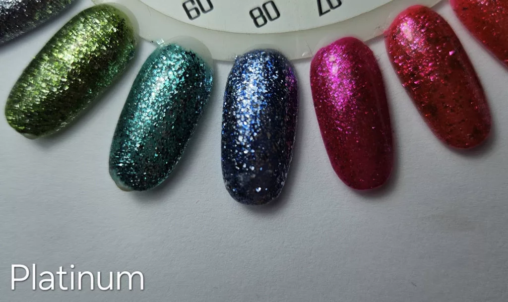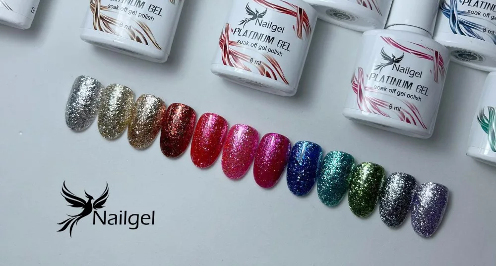 Colecția de geluri Platinum de la marca Nailgel conferă un luciu special unghiilor clienților tăi. Aceste geluri sunt strălucitoare în mod metalic și au o rezistență ridicată la uzură. Datorită efectului metalic, aceste geluri par a fi acoperite cu mici foițe cromate.